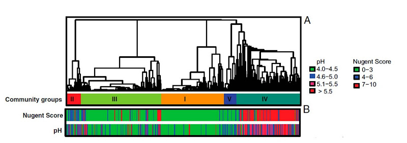 Esquema que muestra los cinco agrupamientos genéticos (I al V) encontrados en la microbiota vaginal. La cantidad de ramas nos indica la diversidad microbiana. En la parte de abajo tenemos los valores Nugent para los distintos microorganismos caracterizados. El color rojo indica que esos micrroganismos pueden participar en procesos de vaginosisi aunque se encuentren en la microbiota normal. En la barra más inferior se indica el valor de pH óptimo de dichos microorganismos. (fuente: Ravel et al.)