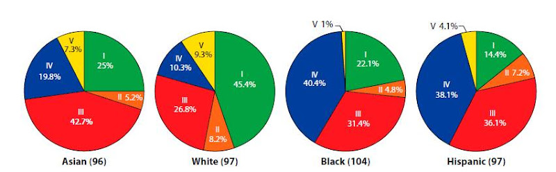 Representación de la distribución de las comunidades bacterianas vaginales por grupo étnico. Entre paréntesis se muestra el número de mujeres muestreadas en cada grupo étnico. (fuente Ravel et al.)