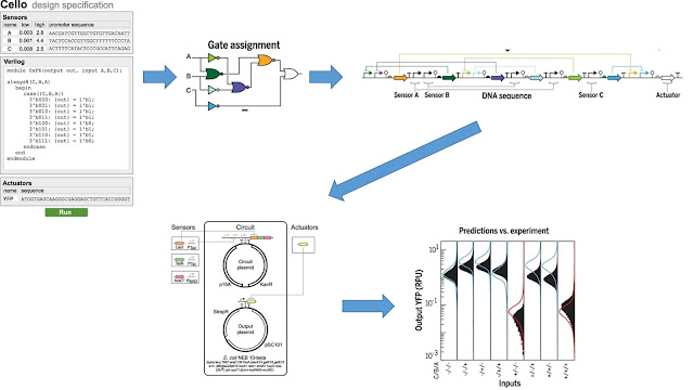 Desde hace tiempo tenemos la capacidad tecnológica de construir circuitos genéticos para que las células respondan a las señales que nosotros pongamos en su entorno y así generar la respuesta metabólica que nosotros deseemos. Es decir, podemos rediseñar los sistemas biológicos naturales ya existentes para que hagan algo útil que nosotros queramos. Un paso más en la revolución biotecnológica actual. Evidentemente el primer paso para construir un circuito genético es diseñarlo. Hay varias formas de hacerlo pero una de las más sencillas es la descrita por el grupo liderado por Christopher A. Voight. En el 2016 publicó el artículo “Genetic circuit design automation” (DOI: 10.1126/science.aac7341) en el que se describía la web Cello (www.cellocad.org). Esta web es un entorno virtual en el que se aplican los principios del diseño de circuitos electrónicos basados en la lógica booleana para generar circuitos genéticos. Para ello usa un lenguaje de programación usado por los ingenieros electrónicos, el lenguaje Verilog, para el diseño de puertas lógicas del tipo NOT/NOR. Ese tipo de puertas lógicas tiene su equivalente biológico en los sistemas de proteínas represoras/activadoras de la transcripción. En el artículo además describían el desarrollo de una librería de "biobricks" que representaban a esas puertas lógicas y que podían ser interconectadas para formar el circuito genético que quisiéramos. Una vez diseñado el circuito genético el entorno Cello te proporciona la secuencia de DNA completa de dicho circuito, cómo debe diseñarse el plásmido donde clonar el circuito, los resultados esperados en el nivel de expresión de la proteína actuadora por número de células, etc. Todo listo para clonar en E. coli y que el circuito funcione. En el siguiente vídeo el propio Christopher A. Voight explica con detalle lo que hicieron.